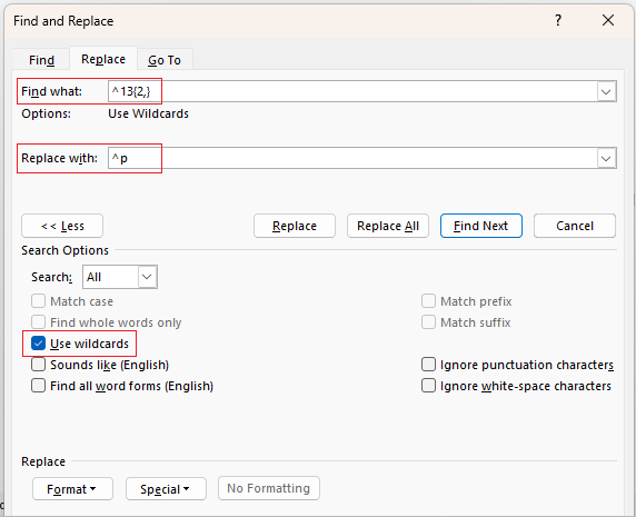 (^p is standard code for a paragraph mark. So why use ^13 above? It's Word being...Word. Both mean the same thing and normally you'd use ^p, but Word doesn't let you use ^p in the 'Find what' field so we use ^13 instead.)